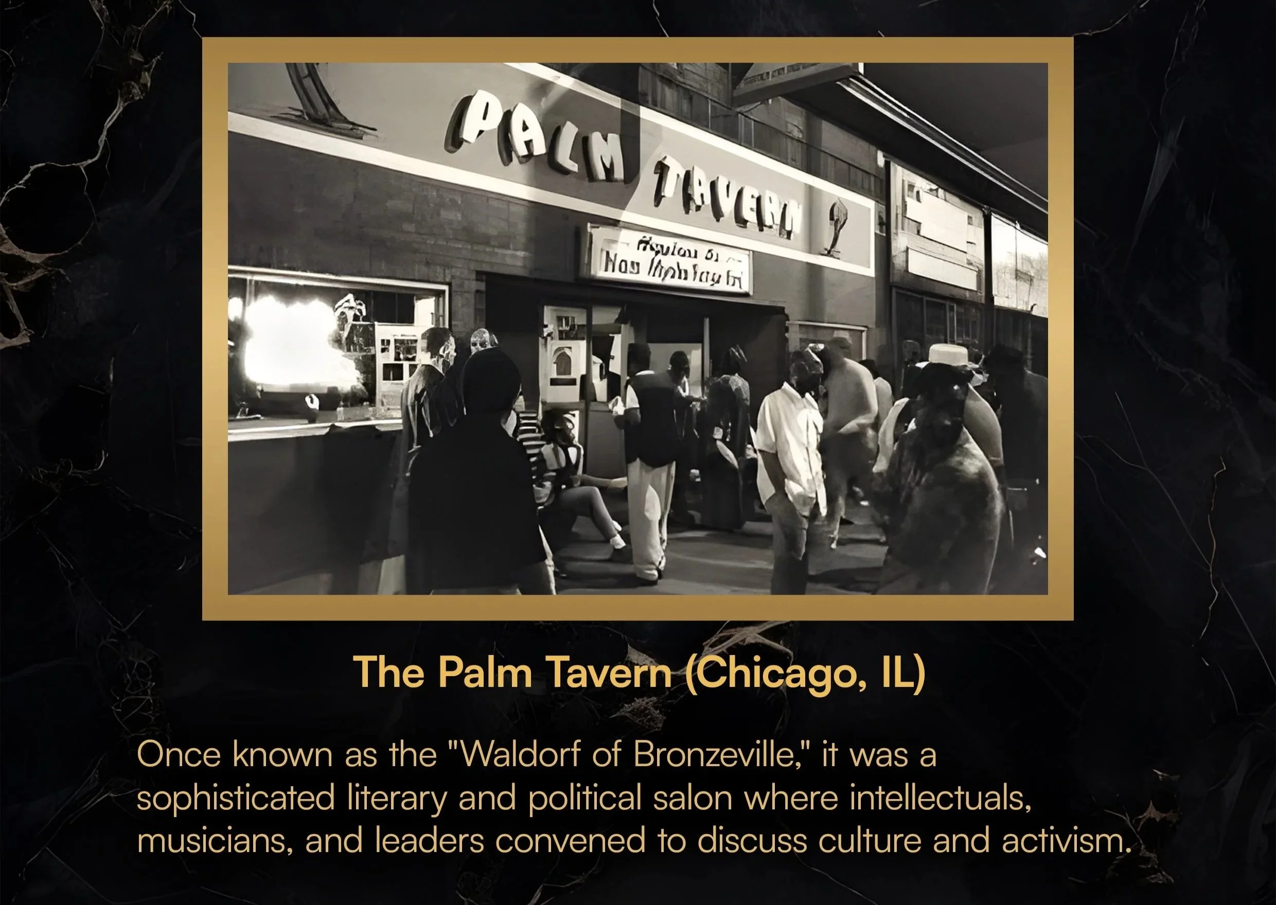 The Palm Tavern, on the southside of Chicago in then Bronzeville district, operated from 1931 (or 1933) to 2006. Bronzeville was a lively Black community during the Great Migration, filled with theaters (Regal, Metropolitan, Savoy Ballroom) and numerous Black-owned businesses, restaurants, and clubs. Despite urban renewal, highways, public housing, and disinvestment devastating the area, the Palm Tavern resiliently endured as a vital historical landmark.